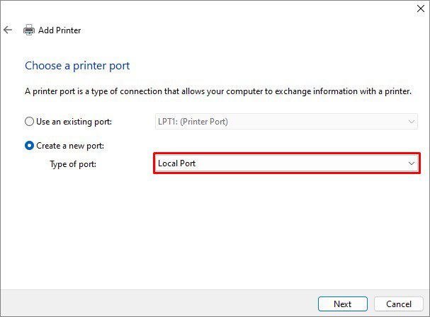 Marque a opção Criar uma nova porta e escolha Porta local na lista suspensa correspondente.