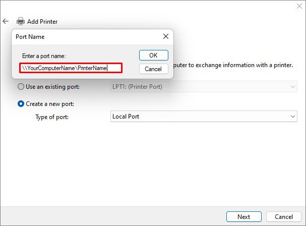 Clique no botão Avançar e digite o nome da porta no próximo pop-up caixa. O nome da porta se parece com (\\YourComputerName\PrinterName).