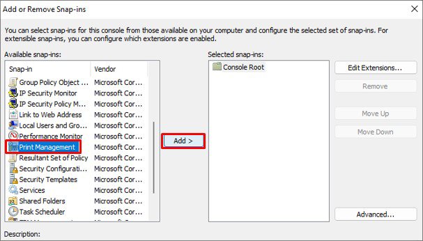 Pressione a tecla Windows + R. No campo de texto de Executar, digite mmc seguido da tecla Enter para abrir o Microsoft Management Console. Clique em Arquivo na barra de menus e selecione Adicionar/Remover Snap-ins.Role em Snap-ins disponíveis e selecione Gerenciamento de impressão >.Clique no botão Adicionar > e clique em Adicionar o servidor local na próxima janela.
