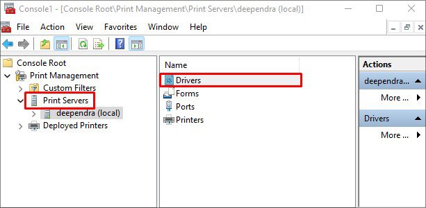 Clique em Concluir Clique no botão OK . Clique em Gerenciamento de impressão em Raiz do console e selecione Servidores de impressão. Clique em Drivers opção mostrada abaixo do nome do seu PC.