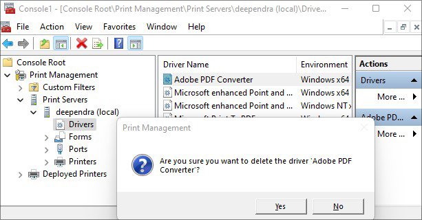 Procure o nome do driver de impressora que está causando problemas. Pressione a tecla DEL no teclado para excluir a entrada e clique em Sim no pop-up de confirmação.