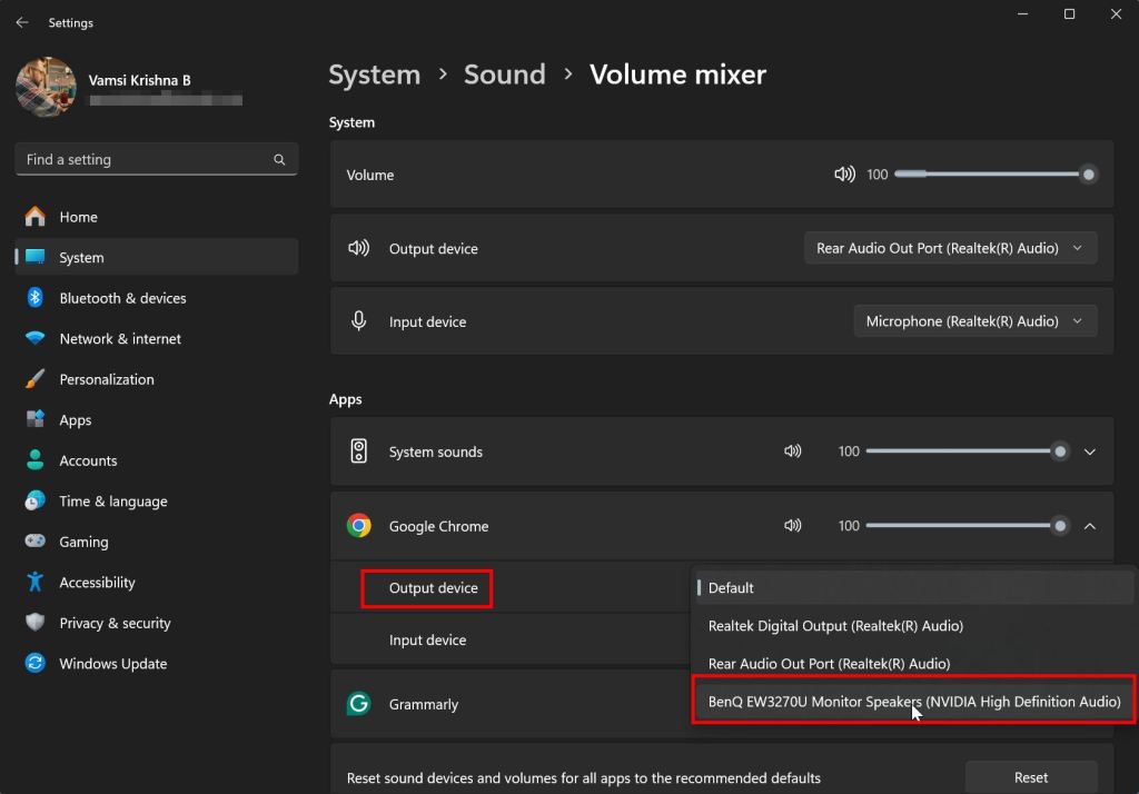 agora, outigante o dispositivo de saída menu. Por exemplo, quero usar os alto-falantes do meu monitor com meu navegador Chrome. Então, eu o selecionei do menu suspenso”Saída”.