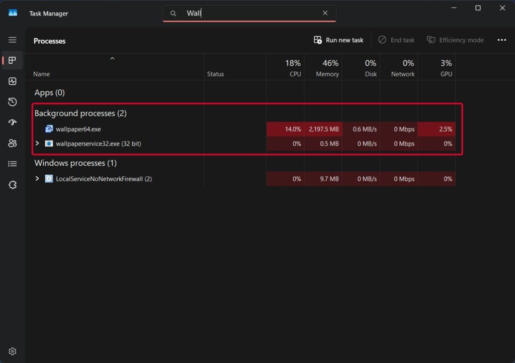 Como você pode ver, o uso do Wallpaper Engine é de quase 14% da CPU e vai até 25%, com 2,2 GB Uso de RAM de até 3-4 GB e 2,5% de uso de GPU com apenas um papel de parede de tamanho moderado. Observe que eu uso o Wallpaper Engine em todos os meus três monitores 2K.