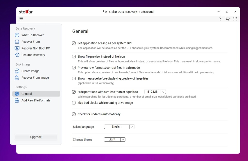 O painel de configurações é igualmente organizado, oferecendo opções simples para visualização de arquivos, seleção de idioma e outros pequenos ajustes. Essa filosofia de design reforça que o Stellar foi desenvolvido para ser acessível, garantindo que mesmo usuários com conhecimento técnico mínimo possam navegar pelo processo de recuperação com confiança.