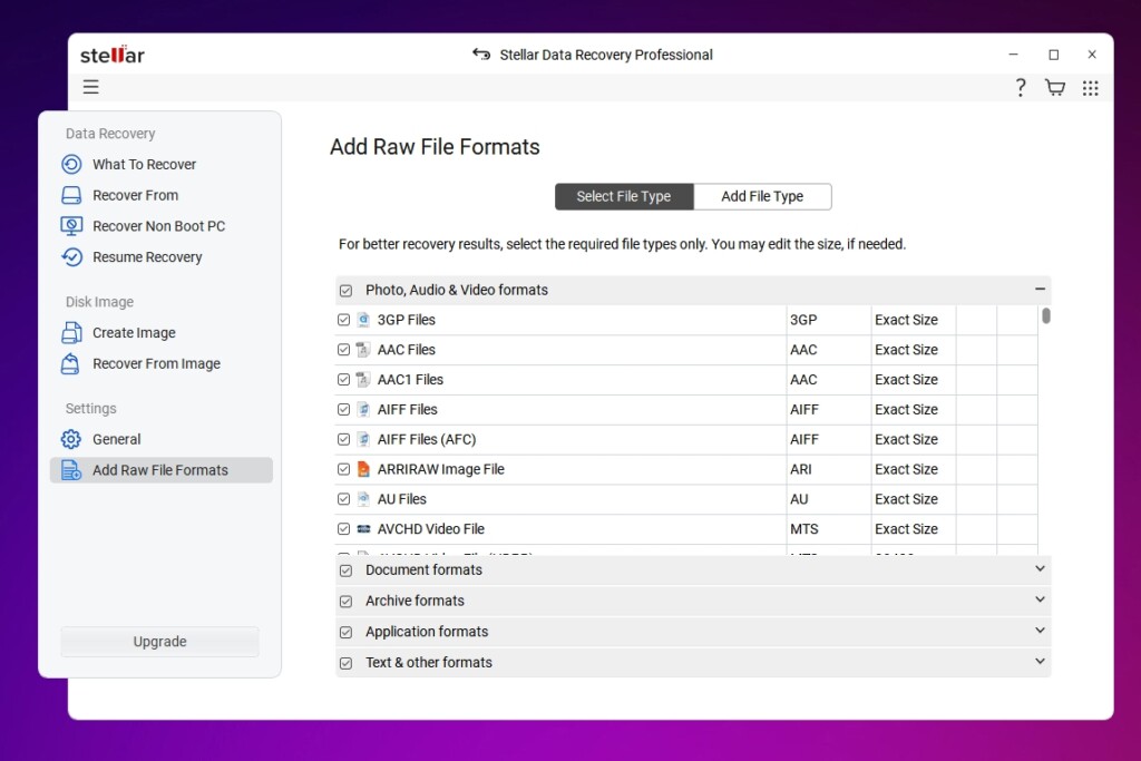 Para usuários avançados, Stellar oferece uma opção para adicionar assinaturas de arquivos personalizadas, estendendo sua recuperação recursos além dos formatos padrão suportados.