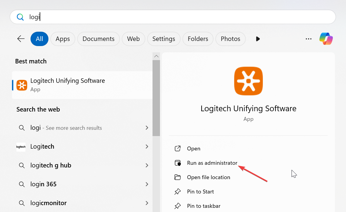 Certifique-se de conceder privilégios de administrador quando solicitado. Após a conclusão da instalação, abra o menu Iniciar no Windows e navegue até a pasta Logitech. Selecione Logitech Unifying Software e clique com o botão direito para escolher Executar como administrador.