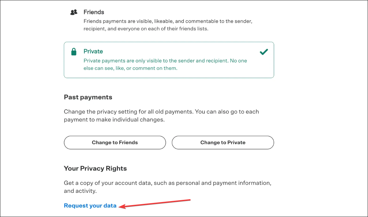 Para obter os dados completos da sua conta, abra o Venmo no seu navegador e vá para a página Configurações. Escolha Solicitar seus dados. Você também pode encontrar isso em Privacidade no aplicativo.