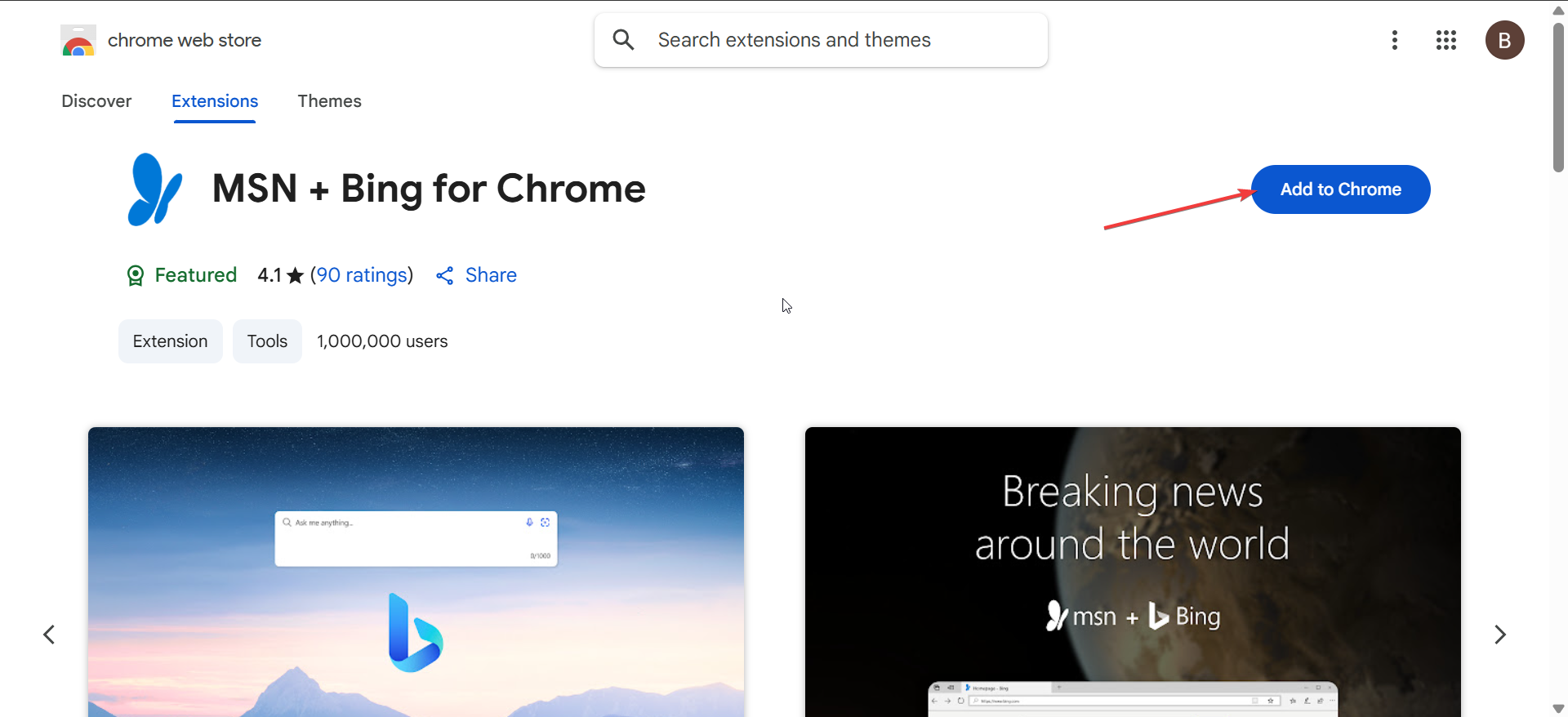 MSN + Bing para Chrome: esta extensão oficial define automaticamente o MSN como sua página inicial e o Bing como seu mecanismo de pesquisa padrão. É útil se você deseja uma configuração com um clique, sem configuração manual. Basta pesquisar MSN + Bing para Chrome na Chrome Web Store e clicar em Adicionar ao Chrome. Nova guia do MSN para Chrome: este complemento substitui a tela da nova guia por notícias, previsão do tempo e tópicos de tendência personalizados do MSN. É opcional, mas dá ao seu navegador Chrome a mesma sensação da experiência da página inicial do MSN.