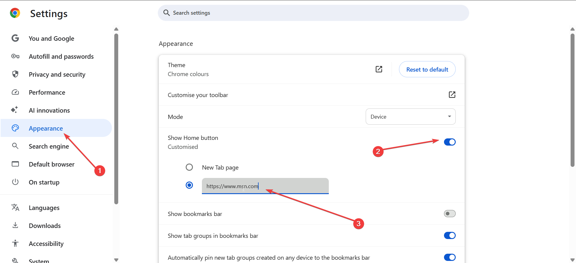 Abra o Chrome e clique nos três pontos no canto superior direito. Em seguida, selecione Configurações, abra a seção Aparência e ative o botão Mostrar botão inicial. Agora, clique na opção de rádio para Insira o endereço da web personalizado e digite https://www.msn.com.