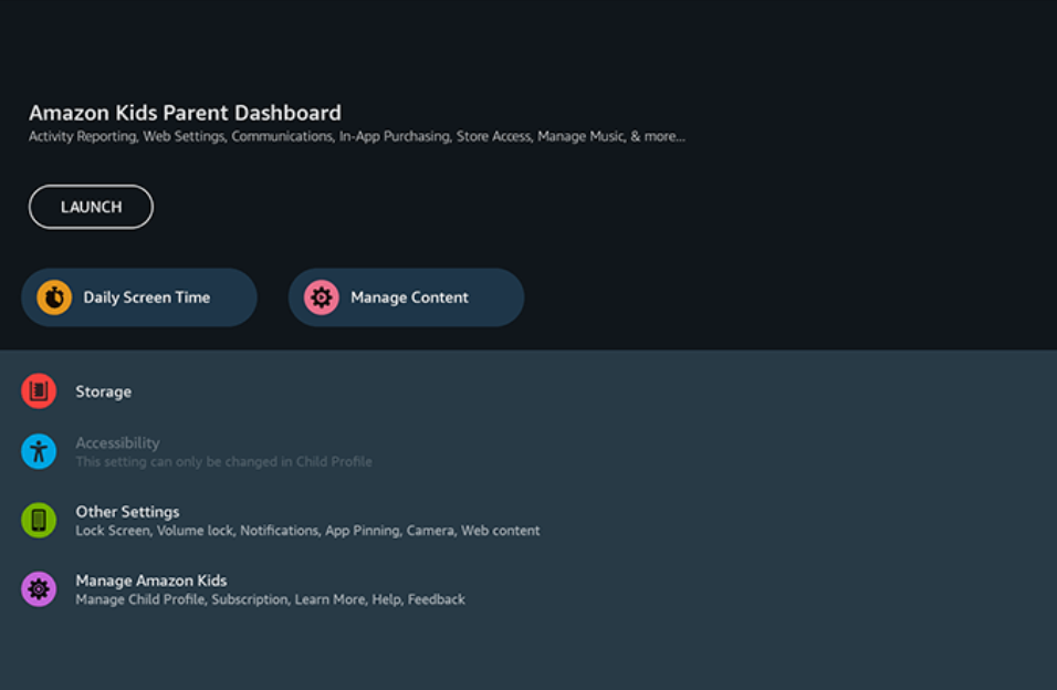 Deslize de cima para baixo na tela e toque em Configurações > Perfis e Biblioteca da família. Escolha o perfil do seu filho e selecione Amazon Kids. Agora, escolha a opção Painel dos Pais para poder gerenciar os controles sem sair do dispositivo.