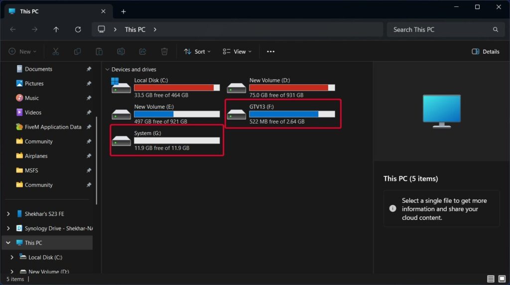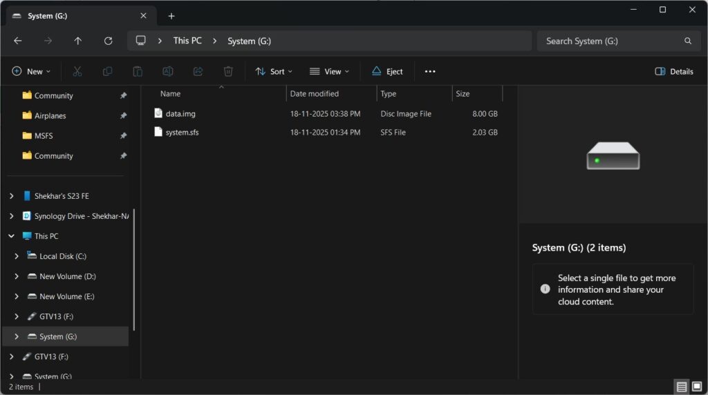Abra a unidade inicializável, que criamos usando Rufus nas etapas anteriores; na maioria das vezes será nomeado como GTV13. Haverá um arquivo chamado system (system.sfs); corte o arquivo e cole-o na unidade de armazenamento recém-criada, que criamos por meio do Gerenciamento de disco.