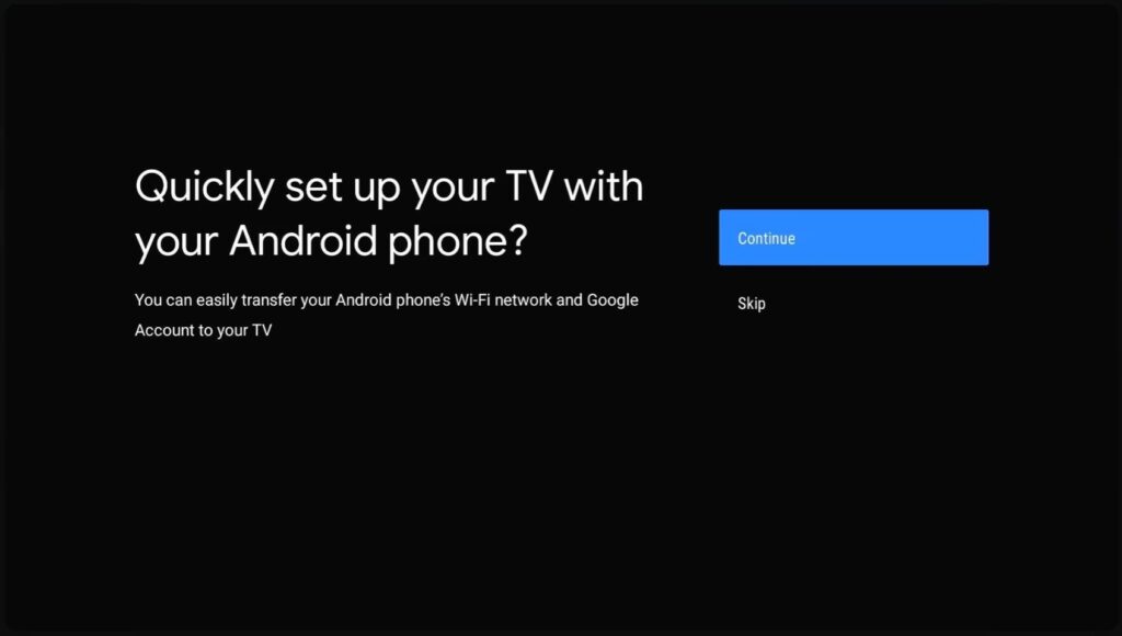 Configuração do Google TV – Seleção de idioma Agora, você será solicitado a continuar a configuração usando seu dispositivo Android; será rápido e descomplicado, pois transfere a rede Wi-Fi do seu dispositivo e a conta do Google. Se você não quiser, clique no botão Pular.