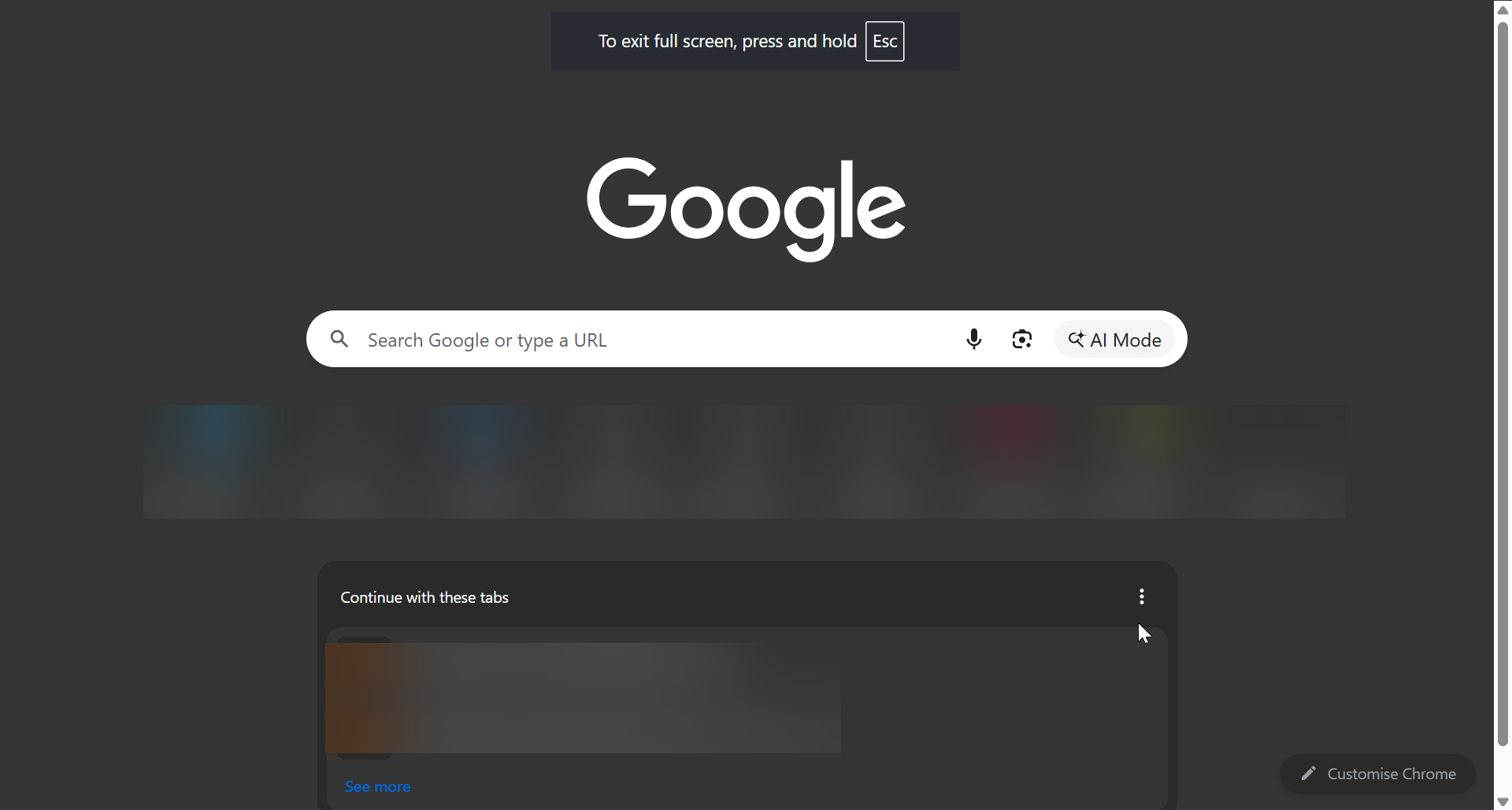Você também pode verificar a tela inteira no menu do Chrome. Clique no menu de três pontos e procure o indicador de tela cheia. Isso ajuda você a voltar ao modo normal se o atalho do teclado não responder.