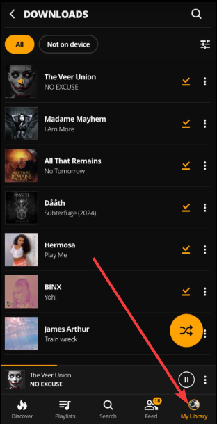 O Audiomack mantém todos os itens off-line em uma única área do aplicativo. Isso facilita a revisão da sua biblioteca e a remoção de itens desnecessários.