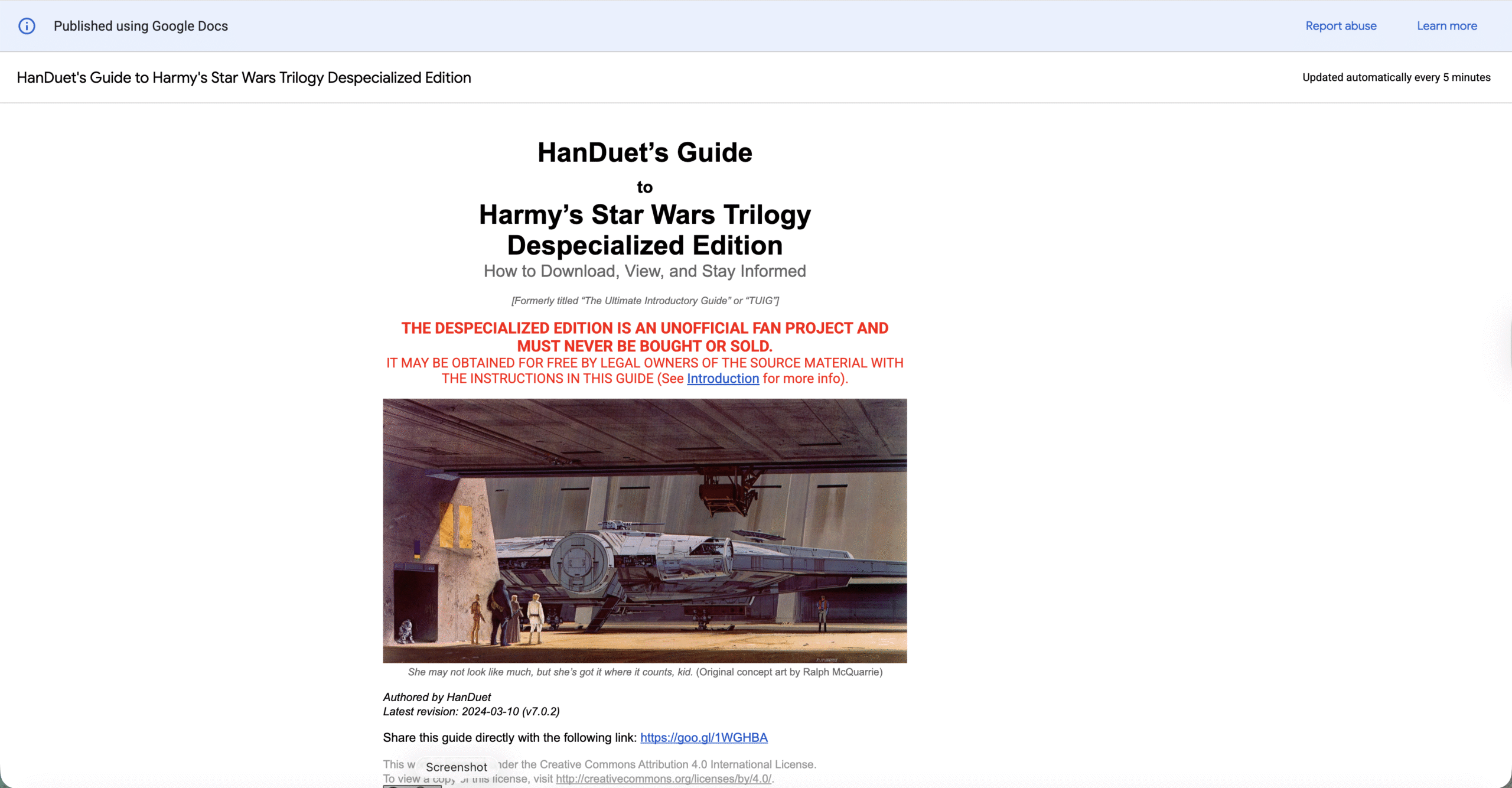Embora a Edição Despecializada não seja oficialmente endossada pela Lucasfilm, é um projeto de restauração feito por um fã e está disponível gratuitamente para uso pessoal.