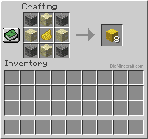 Colete quatro blocos de cascalho e quatro blocos de areia para preparar a base da receita do pó de concreto. Escolha uma tinta que combine com a cor que você deseja para o seu concreto e coloque-a no seu inventário. Abra a mesa de trabalho e use a grade 3×3 para combinar cascalho, areia e tinta em qualquer ordem.
