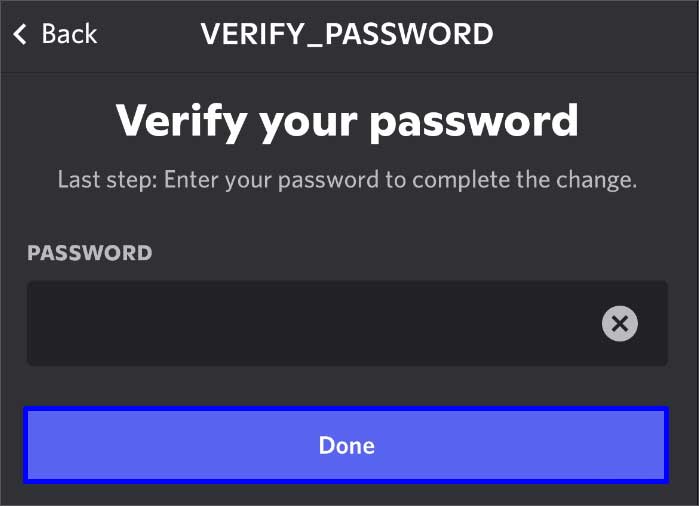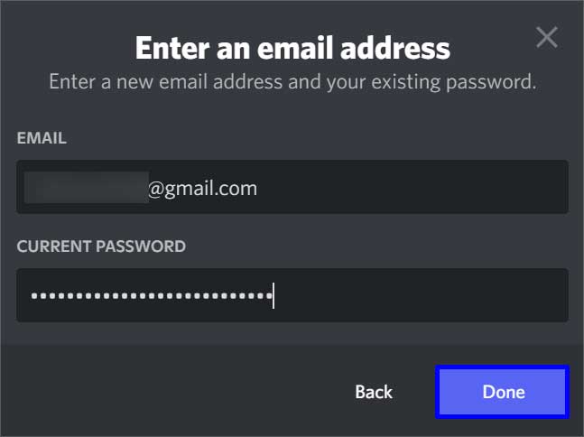 Em seguida, digite seu novo e-mail. Digite sua Senha da conta do Discord e clique no botão Concluído .