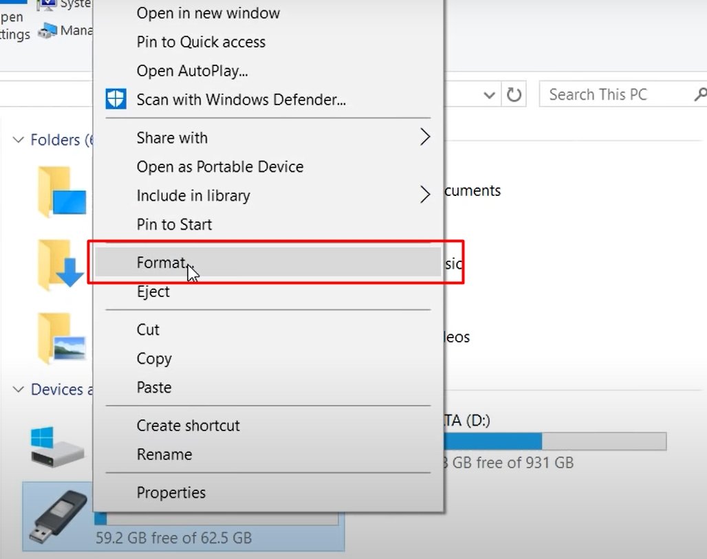 Insira o USB em seu computador. Pressione Windows + E para abrir o explorador de arquivos.Clique com o botão direito do mouse na unidade flash USB. Selecione Formatar… nas opções.