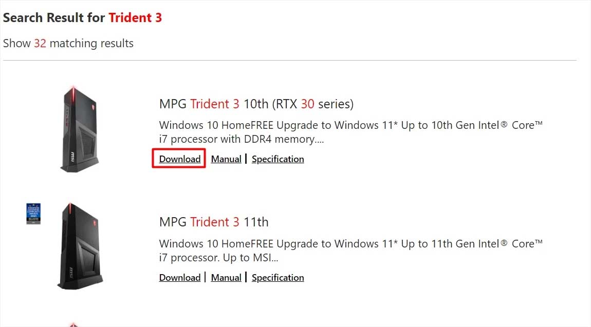 Digite o número do modelo da sua placa-mãe na barra de pesquisa do site da MSI. Clique em Download na placa-mãe listada.