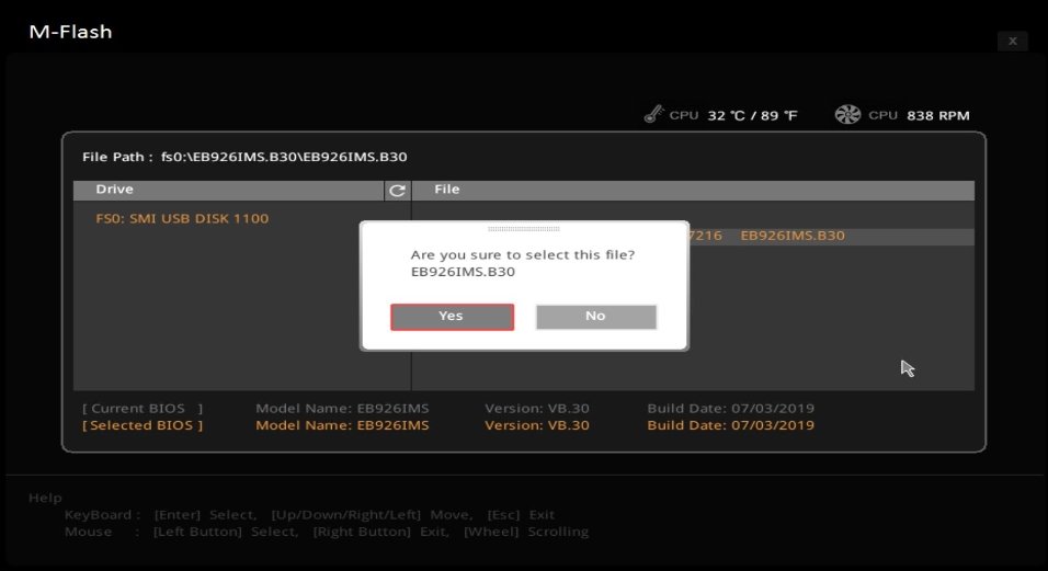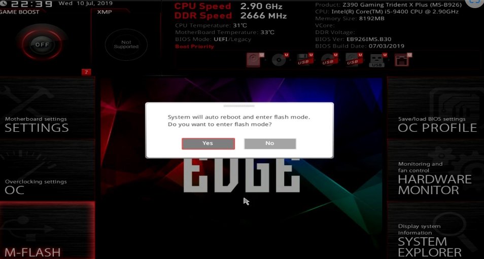 Entre no menu BIOS tocando continuamente na tecla Del enquanto liga o computador.Escolha o modo M-FLASH e, em seguida, Sim.