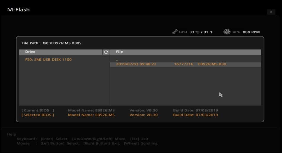 Selecione a unidade USB inserida e também a pasta BIOS.Clique no arquivo de atualização do BIOS.