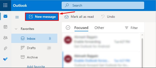 Faça login em sua conta da Web do Outlook.Clique no botão Nova mensagem no canto superior esquerdo para criar uma nova mensagem de e-mail.