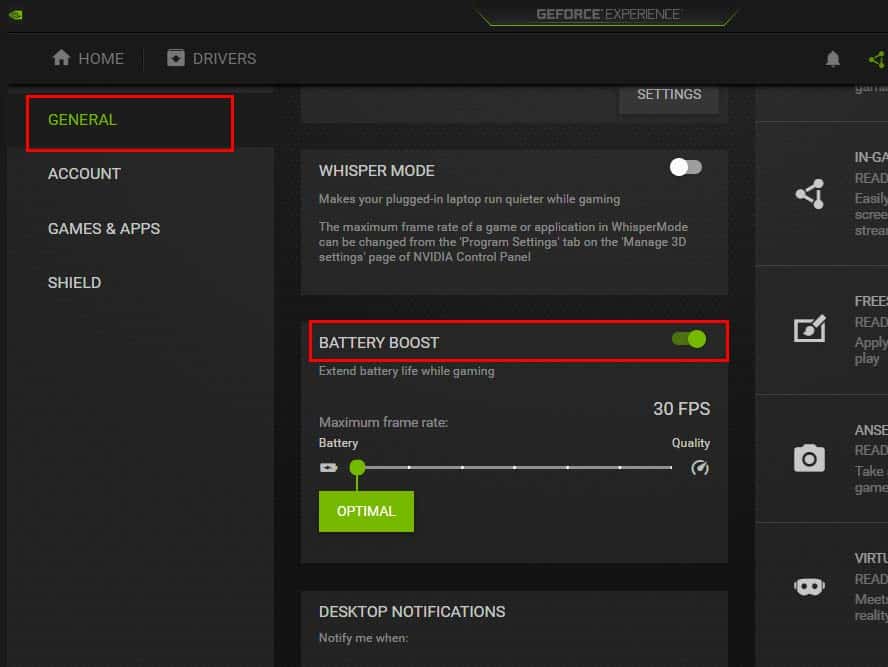 Para desativar o recurso de reforço de bateria na NVIDIA GeForce Experience: