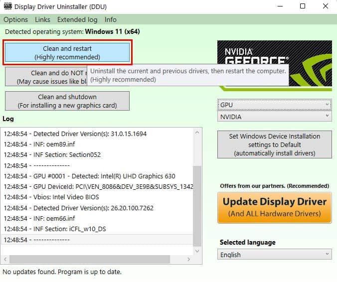 Baixe e extraia o aplicativo DDU mais recente acessando este site.Agora, reinicie seu PC no modo de segurança e execute o aplicativo DDU. Clique no botão Limpar e reiniciar opção. Isso desinstalará todos os drivers atuais do seu PC e, em seguida, reinicializará seu PC.