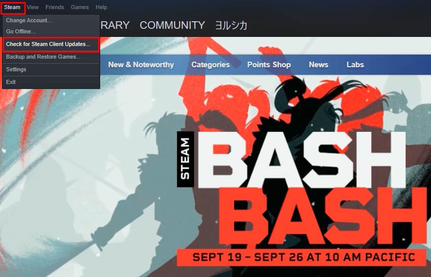 Abra o aplicativo cliente Steam no seu PC. na barra de menu, clique em Steam no canto superior esquerdo e selecione a opção Verificar atualizações do cliente Steam.