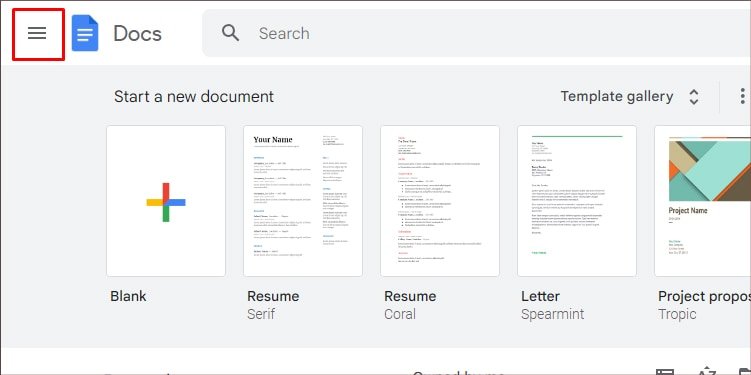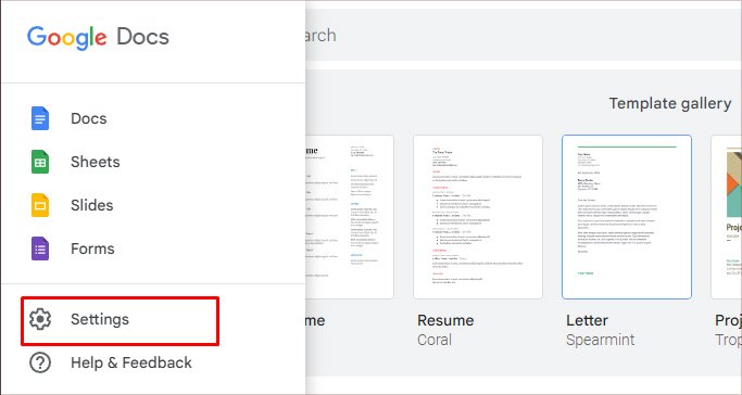 Na página inicial do Documentos, selecione o hambúrguer menu no canto superior esquerdo.Selecione Configurações.