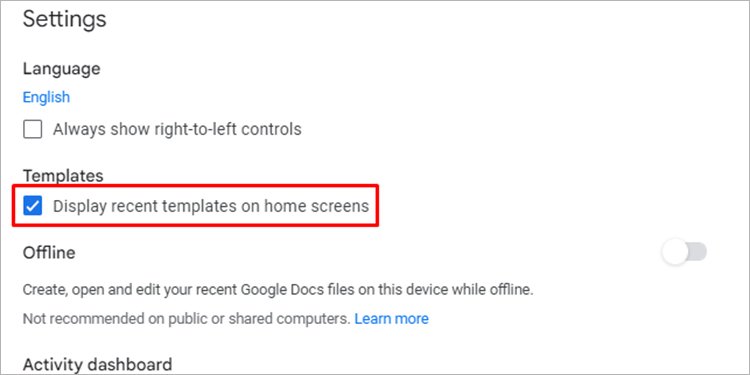 Em Modelos, selecione a caixa ao lado de Exibir modelos recentes nas telas iniciais.