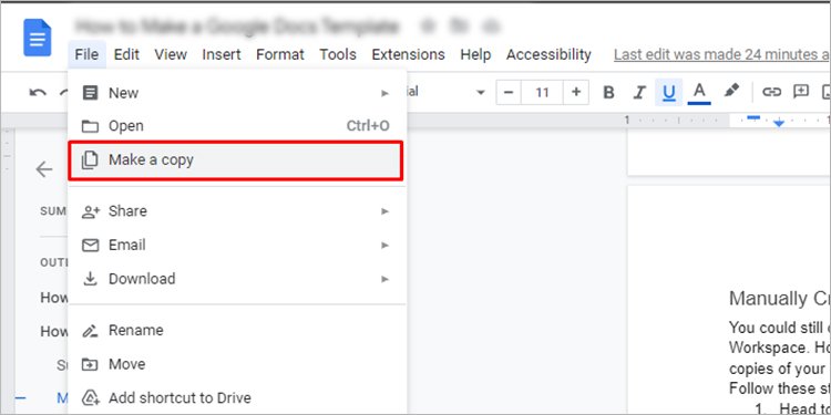 Vá para Google Docs em seu navegador.Crie um novo documento ou abra o documento para o qual deseja criar um modelo.Na barra de menus, vá para para Arquivo. Selecione Fazer uma cópia.