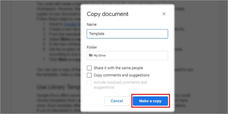 Na nova janela, nomeie o documento como”Modelo“. Definir a localização do seu documento em Pasta e defina permissões adicionais de acordo com sua preferência.Clique em Fazer uma cópia.