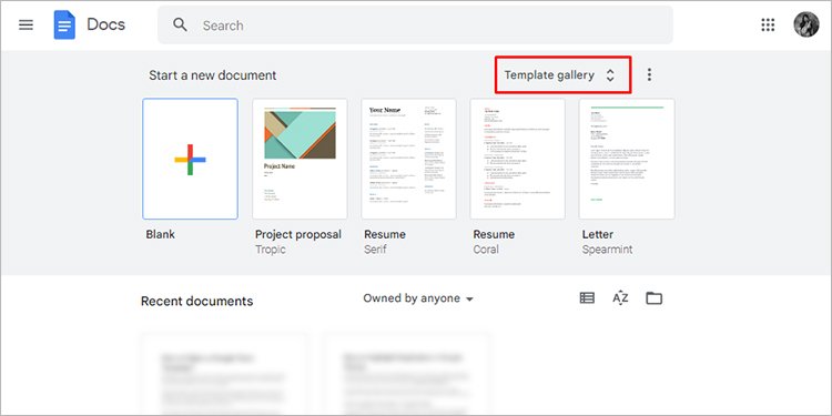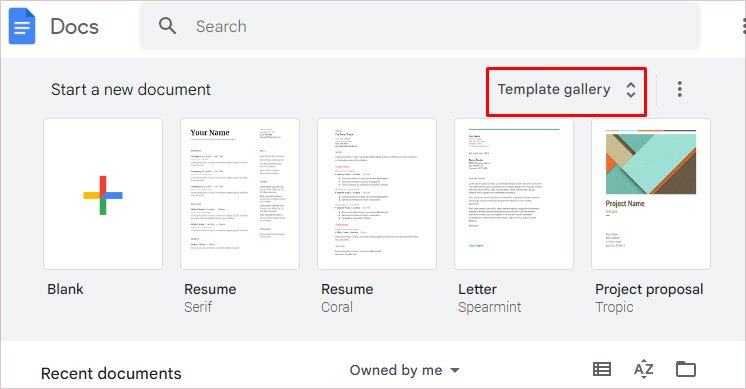 Vá para a página inicial do Google Docs.Selecione Galeria de modelos no canto superior direito da a janela.