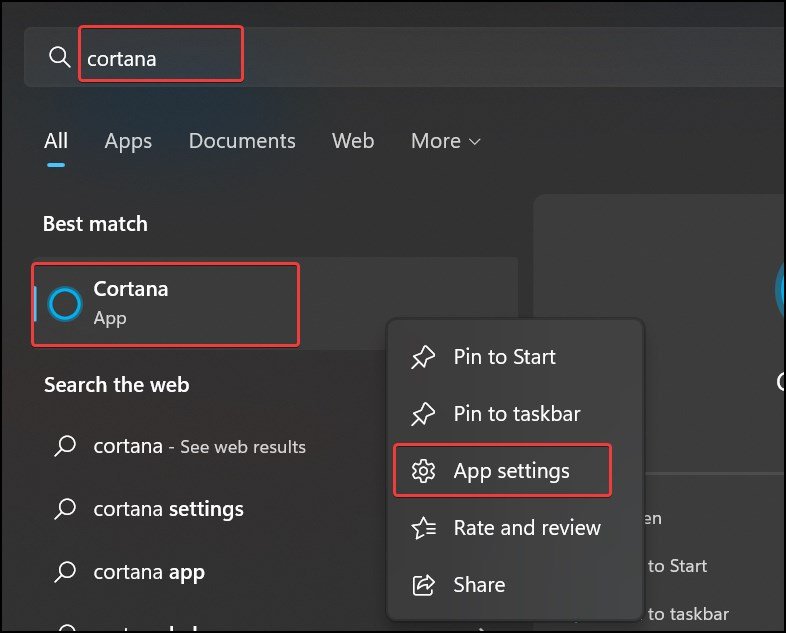 Agora, vá para o menu Iniciar e encontre Cortana. Clique com o botão direito do mouse e selecione Configurações de aplicativos.