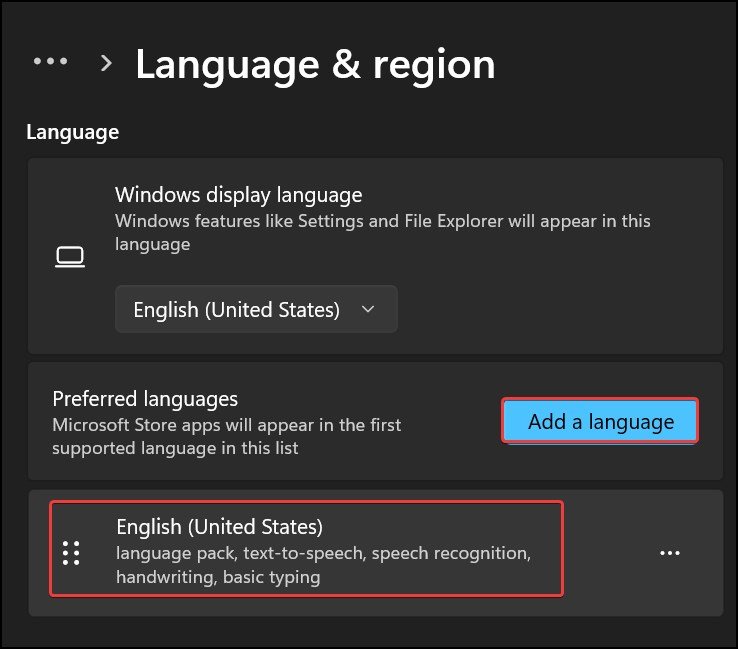 Certifique-se de que o idioma preferencial esteja definido como inglês (Estados Unidos). Caso contrário, clique no botão Adicionar um idioma e selecione Inglês (Estados Unidos).