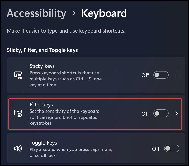 Teclas de filtro é um recurso de acessibilidade em Windows que não registra pressionamentos repetidos de teclas, projetado para pessoas com deficiência. Ele diminui a taxa de repetição de teclas, o que pode parecer que o teclado não está funcionando bem. Você pode desativá-lo para obter uma melhor entrada de pressionamento de tecla.