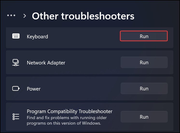 Encontre a seção Teclado e clique em Executar para iniciar o solucionador de problemas.