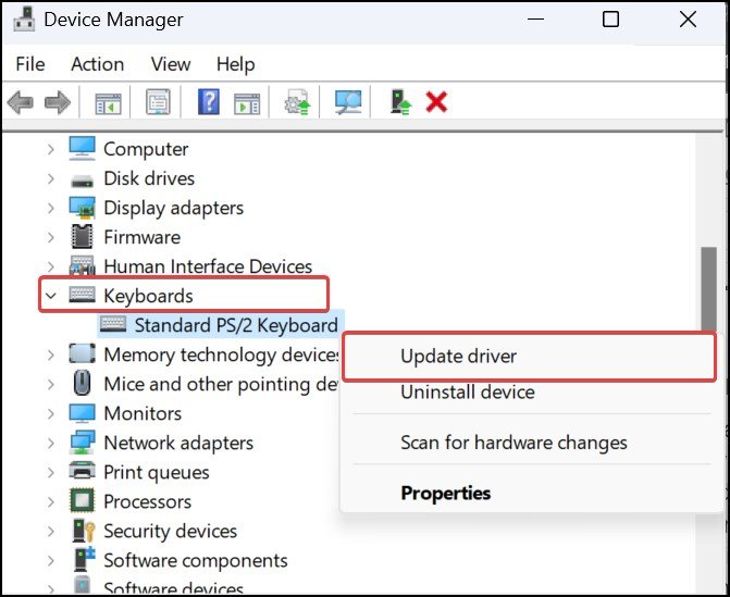 Clique com o botão direito do mouse no botão do menu Iniciar e vá para o Gerenciador de dispositivos.Expanda a lista de dispositivos em Teclado.Clique com o botão direito do mouse no dispositivo e selecione Atualizar driver.