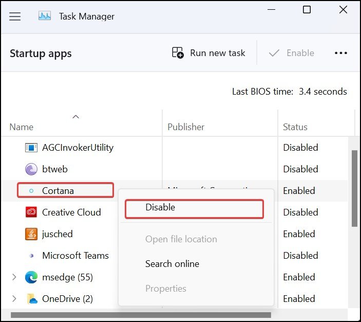 Vá para o Gerenciador de Tarefas clicando com o botão direito do mouse no botão do menu Iniciar. Vá para Inicializar Tab.Encontre Cortana na lista de Aplicativos.Clique com o botão direito do mouse e selecione Desativar .
