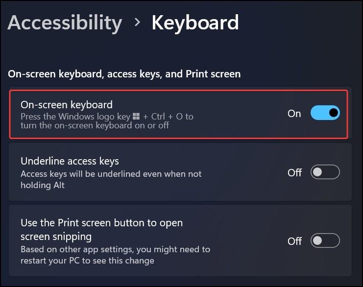 Navegue até Configurações no menu Iniciar. Vá para Acessibilidade > Teclado.
