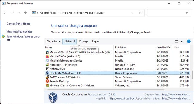 Os primeiros métodos são fáceis de seguir, mas se eles não funcionarem, você também pode usar os dois últimos métodos CLI para forçar a desinstalação do VirtualBox. Se o problema não for resolvido apesar disso, recomendamos verificar a seção final para obter as etapas para realizar uma remoção completa.