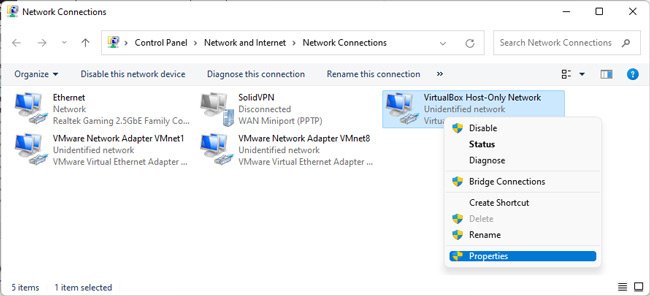 Agora, pressione Win + R, digite ncpa.cpl e pressione Enter.Clique com o botão direito do mouse na rede VirtualBox e selecione Propriedades.