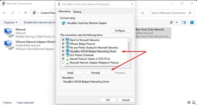 Selecione o VirtualBox Bridged Networking Driver e clique em Desinstalar l.