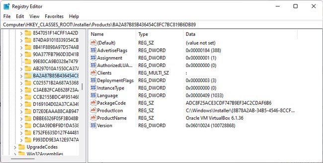 Pressione Win + R, digite regedit e pressione Enter. Navegue até: Computer\HKEY_CLASSES_ROOT\Installer\Products\.Selecione a primeira chave e marque a Nome do produto. Repita o mesmo com o restante das teclas até encontrar a chave do VirtualBox.
