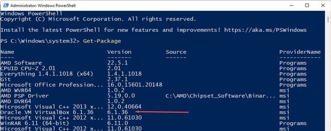 Pressione Win + R, digite powershell e pressione CTRL + Shift + Enter.EnterGet-Package e anote o nome completo do VirtualBox.Substitua packagename pelo valor da Etapa 2 e execute o seguinte comando: