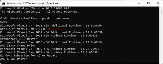 Pressione Win + R, digite cmd e pressione CTRL + Shift + Enter. Digite wmic product get name e pressione Enter.Pode levar um minuto para obter a saída. Quando ele aparecer, anote o nome completo do VirtualBox. Substitua o nome do programa pelo valor da Etapa 3 e execute o seguinte comando: