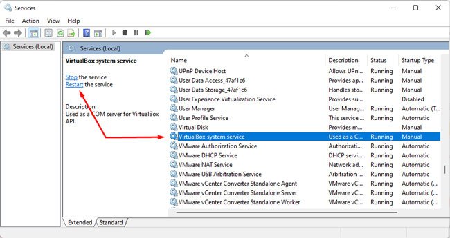Pressione Win + R, digite services.msc e pressione Enter. Pare o serviço do sistema VirtualBox.