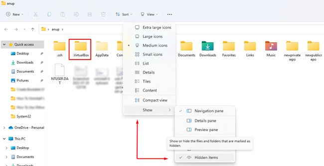 Se você deseja excluir os arquivos da máquina virtual, navegue até o local onde você armazenou e exclua-os primeiro. Agora, pressione Win + R, digite %userprofile% e pressione Enter. Clique em Exibir > Mostrar > Arquivos ocultos.Agora exclua a pasta.VirtualBox aqui. Ele também pode estar localizado em C:\Users\\Appdata\Local\.Exclua a pasta Oracle de C:\Program Files.Também, exclua a pasta VirtualBox de C:\ProgramData.Finalmente, navegue até C:\ Windows\system32\drivers e exclua os seguintes arquivos: