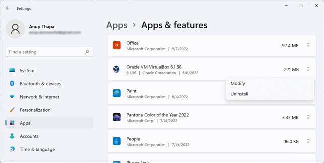 Observação: Se você tentar desinstalar o VirtualBox a partir do menu Iniciar, as mesmas etapas também serão aplicáveis. E em segundo lugar, se o VirtualBox não estiver listado em Aplicativos e recursos, você pode solucionar o problema baixando o instalador para a mesma versão do VirtualBox que você tinha antes e usando o instalador para remover o VirtualBox. No caso de uma desinstalação incompleta, você pode precisar reinstalar o VirtualBox primeiro antes de desinstalá-lo corretamente novamente.